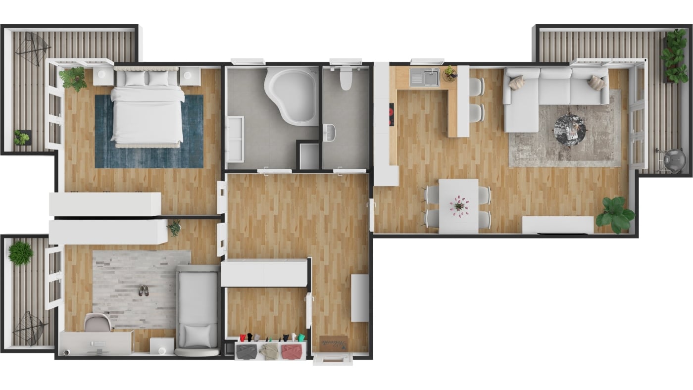 Všechny tři obytné místnosti mají vlastní balkon. Kuchyňská linka kompletně vybavena spotřebiči. V pokoji a v předsíni vestavěné skříně. Koupelna s vanou, dvěma umyvadly a pračkou. Prostorná komora s vestavěným policovým systémem. Samostatné wc s umyvadlem. Videotelefon a alarm s možností napojení na PCO.